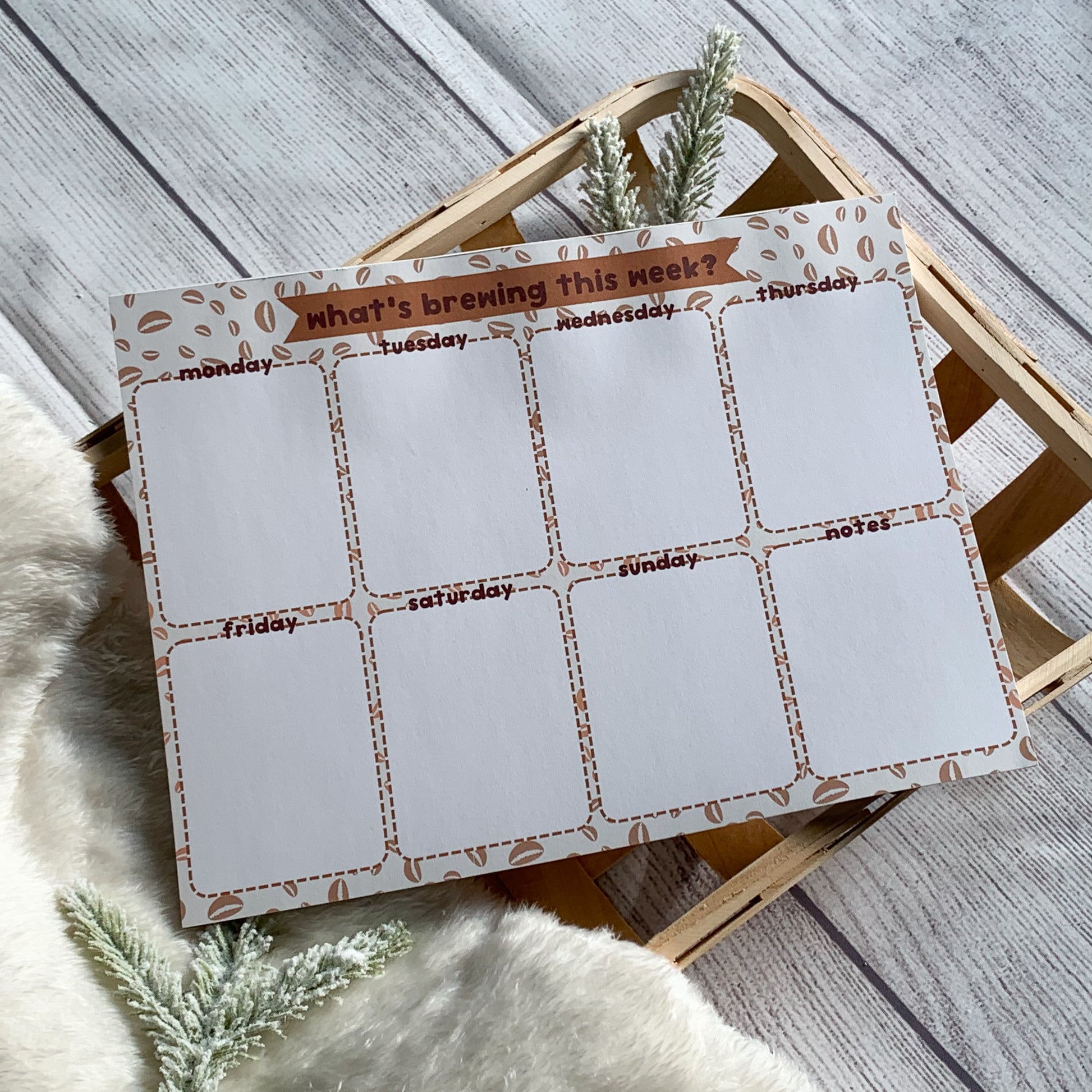 Take your organization to the next level with coffee-themed weekly planner. The full-size sheets are great for keeping track of the week. Sit down on Sunday and plan out your week...appointments, due dates, meal, and more. Perfect for the always hustling, coffee enthusiast!