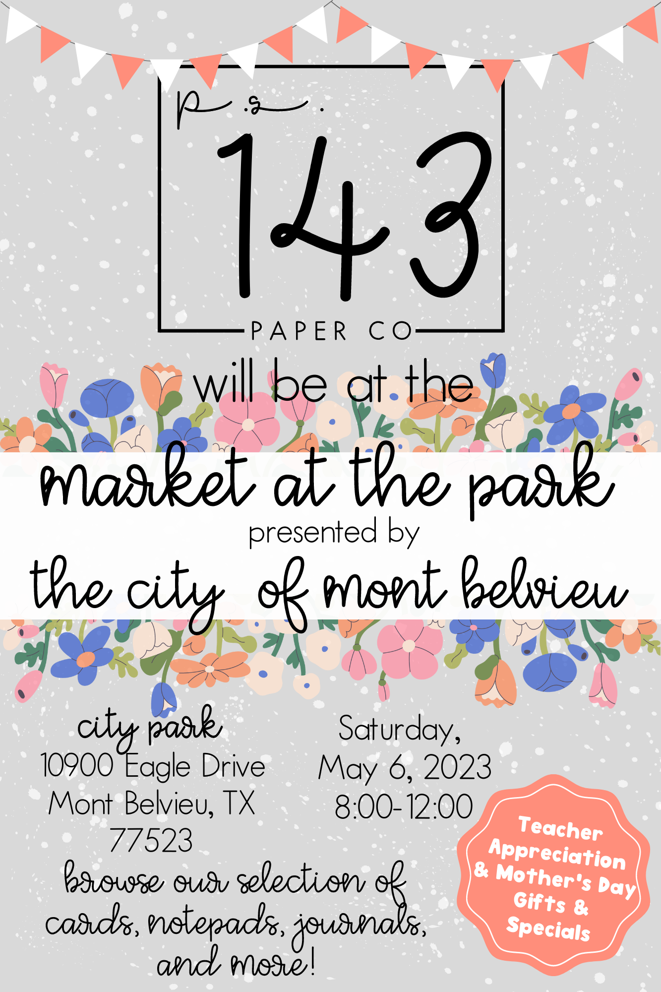 City of Mont Belvieu's Market in the Park will be held on May 6, 2023 from 8:00-12:00.